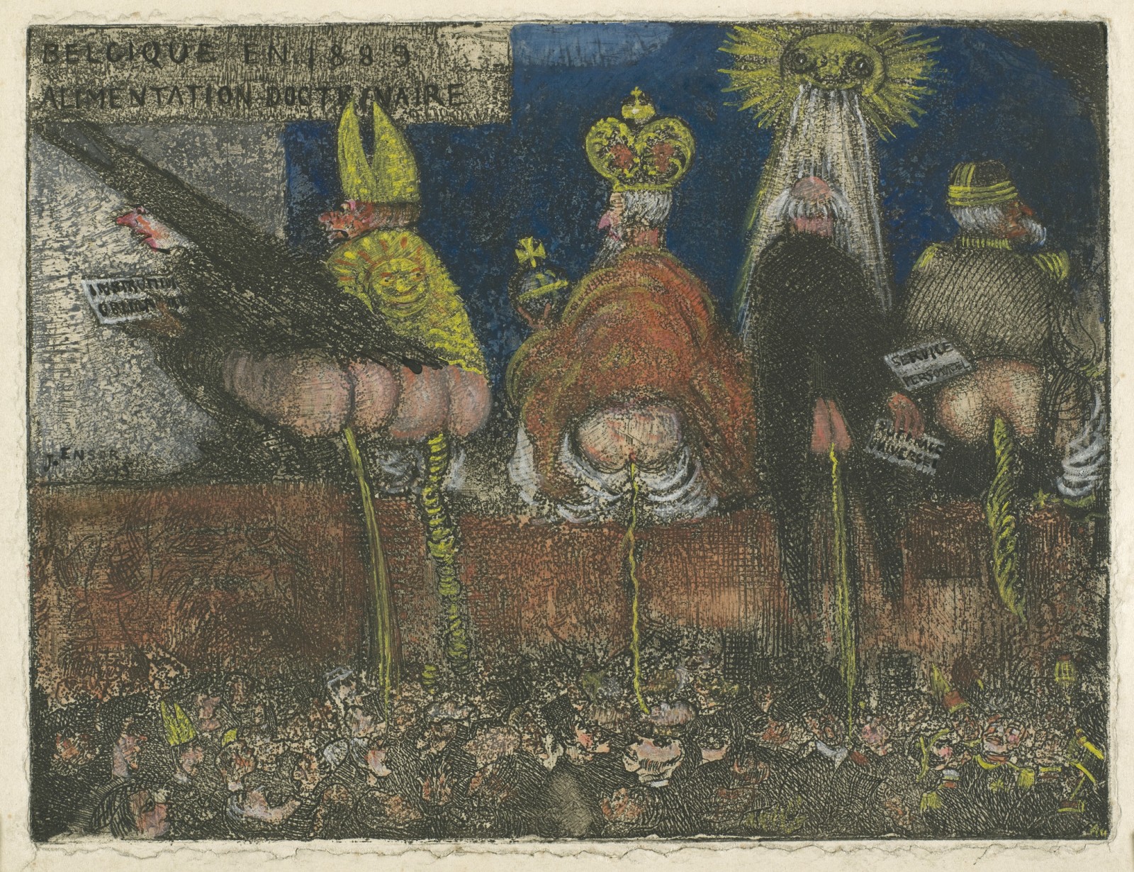 Image: Baron James Ensor (Belgium, Ostende, 1860–1949), The Doctrinal Nourishment (Alimentation doctrinaire), 1889–95 (detail), print, etching printed with tone and hand-colored with white gouache and with red, yellow, and blue chalk and watercolor, image: 9 3/8 x 7 1/16 in. (23.81 x 17.94 cm); sheet: 9 1/4 x 11 5/8 in. (23.5 x 29.53 cm); mat: 16 x 20 in. (40.64 x 50.8 cm), purchased with funds generously provided by the Joan Palevsky Bequest (M.2007.6). © James Ensor Estate/Artists Rights Society (ARS), New York/SABAM, Brussels.