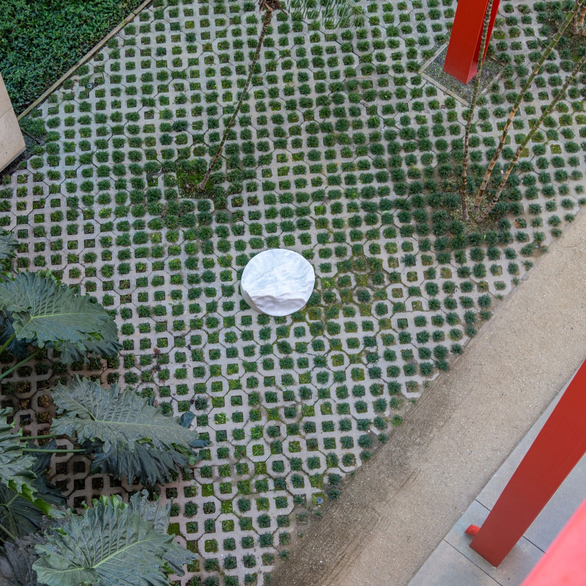Antipodes, the parts of the earth diametrically opposite to each other, have been an important part of Kirsten Mosher’s work, which includes painting, sculpture, video, and text. Soul Mate 180° is an installation comprising two elements: a marble sculpture nested in the garden outside of BCAM, and a short story displayed on a beam outside BCAM, Level 2. The sculpture depicts a wave in the Indian Ocean—the opposite side of the world from LACMA—created from data collected from high-resolution radar, ships, aircraft, satellites, and buoys. The story mentions first kisses and global warming, and is excerpted from Mosher’s ongoing novel in which the sculpture is character.