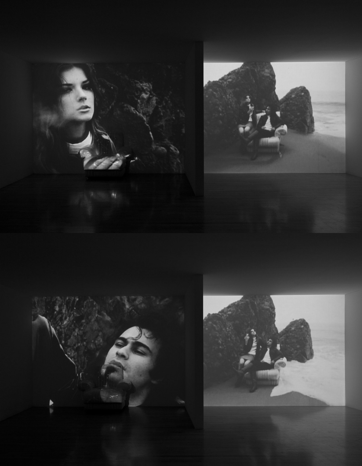 A single room silent double projection, FILMROOM: SMOKEincorporates a real chair and documents two actors interacting with the same chair on the beach at the ocean’s edge. The side-by-side projections, divided by a wall, describe two distinctly different camera compositions: one largely active and detailed, and one more still and general. The filmic picture plane is literally aligned with the meeting of earth and water along the L.A. coastline.