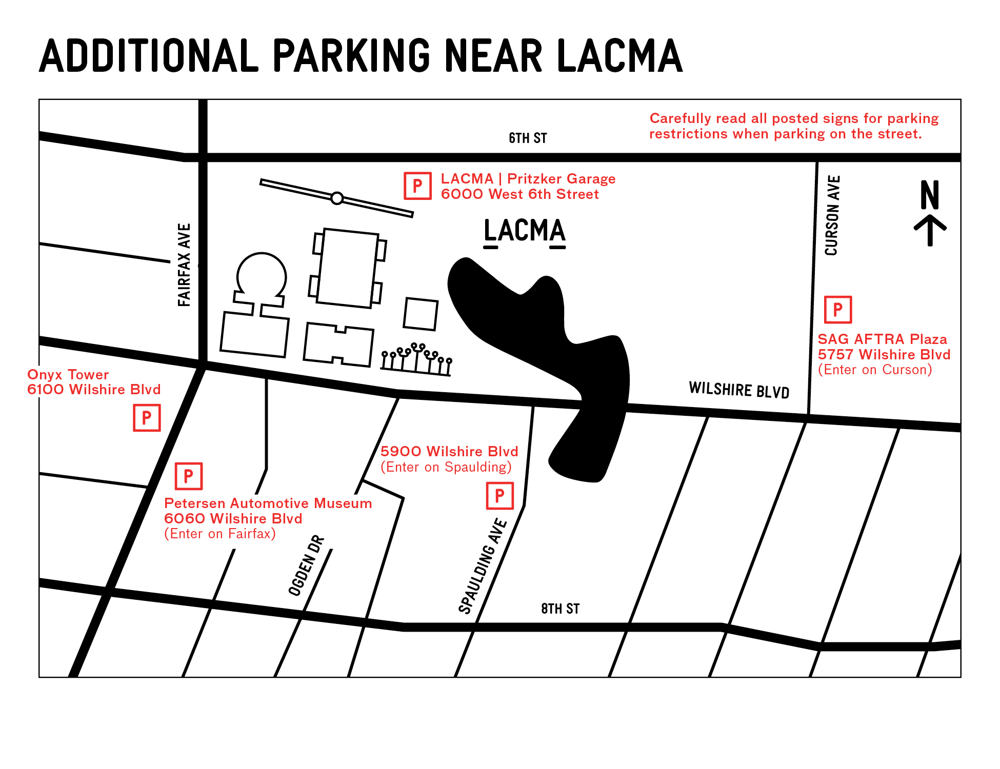 Parking for LACMA is located at the Pritzker Parking Garage on 6th St., just east of Fairfax Ave. and is open daily, 5 am to 10 pm.