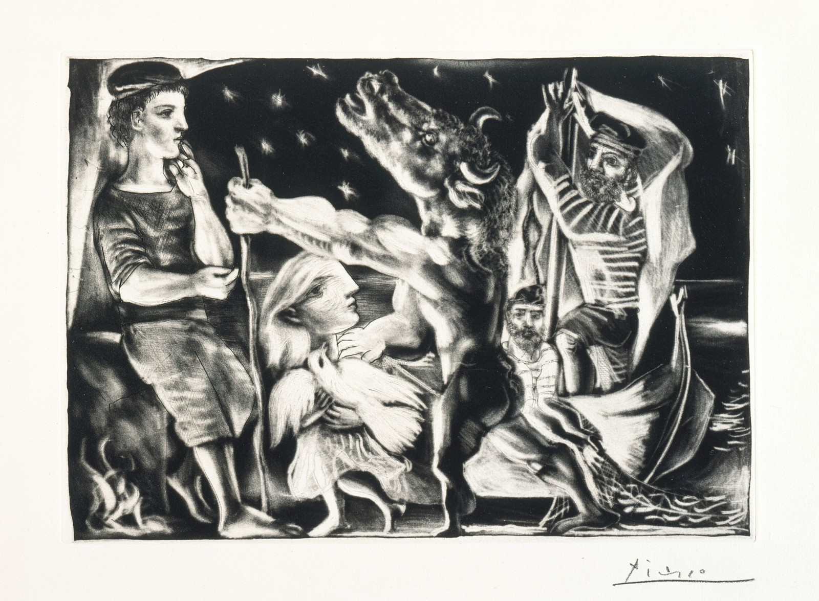 Image, above: Pablo Picasso, Blind Minotaur Led through the Night by Girl with Fluttering Dove, 1934, Los Angeles County Museum of Art, Graphic Arts Council Fund.