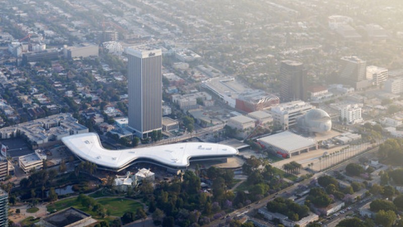 Images: Aerial view of LACMA buildings, including David Geffen Galleries in context of Miracle Mile, photo © Iwan Baan; image of visitors enjoying picnics on LACMA lawns by LACMA-Los Angeles County Museum of Art; image of Descanso restaurant courtesy of Descanso.