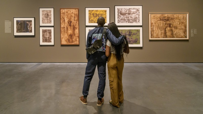 Image Credit: Visitors in Charles White: A Retrospective at the Los Angeles County Museum of Art, March 2019, photo © Museum Associates/LACMA; [LACMA Screen] Visitors in the exhibition Line, Form, Qi: Calligraphic Art from the Fondation INK Collection featuring Qiu Zhijie's Monuments: Revolutionary Slogans of Successive Dynasties (2007) at the Los Angeles County Museum of Art, April 6–October 19, 2025, artwork © Qiu Zhijie, photo © Museum Associates/LACMA