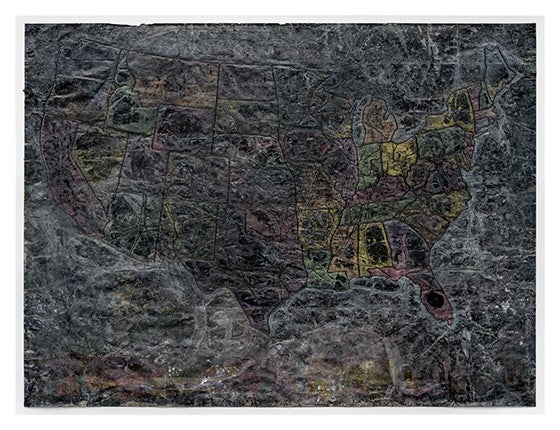 Felipe Baeza’s experience as an undocumented queer immigrant has informed his practice. His work incorporates printmaking and collage; for Untitled (so much darkness, so much brownness), he embroidered an image of a Mexican family attempting to cross the United States border onto a salvaged map. Baeza then laid the paper face-down on the floor and layered “skins” of pigments, powder, and water on top of it. He completed this process around a dozen times for this work, emphasizing the labor and layers that lie beneath the surface of the image.